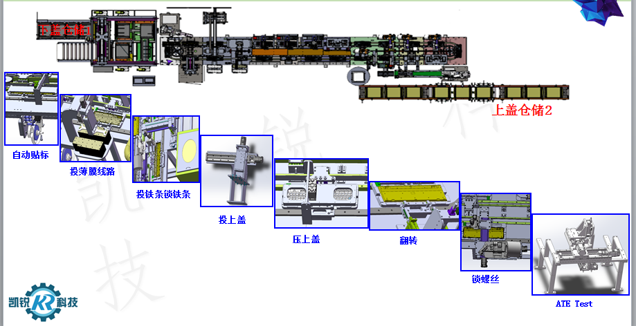 包含兩套倉儲系統(tǒng)(分別完成上、下蓋投料及自動入料系統(tǒng)),貼標、組裝薄膜線路、PCB板、鎖螺絲和測試等組裝及測試工站;采用環(huán)形流水線模式實現(xiàn)托盤的回收及線體的縮短;